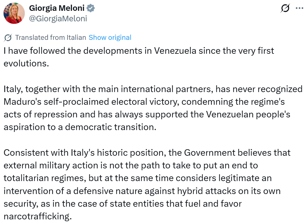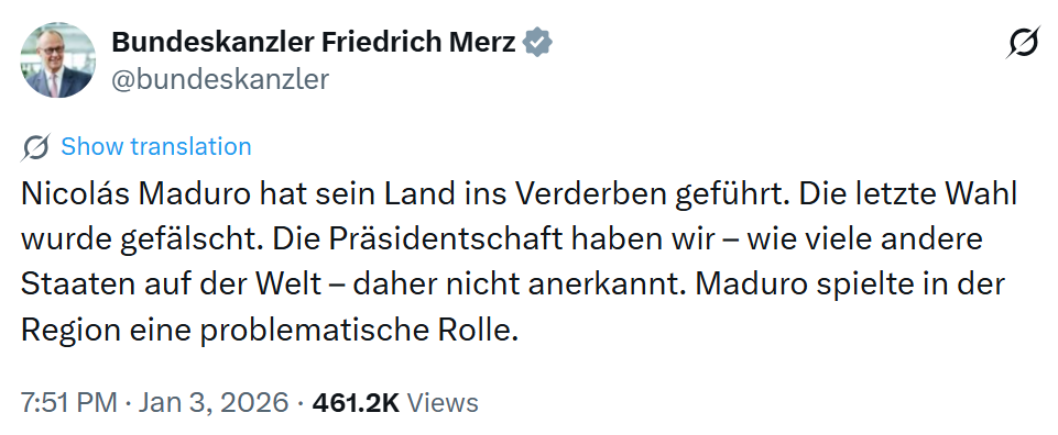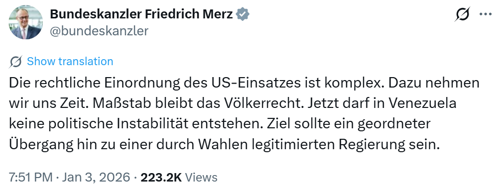 一个值得注意的细节是,英法两国领导人都表示不认同马杜罗总统在委内瑞拉的统治,但也都十分默契地不去评价他们美国盟友的军事行动。德国总理默茨也有表态,但措辞也是相当之“讲究”:上来先数落马杜罗总统一通,之后对美国的军事行动仅用了一个形容词,复杂的(complex)。