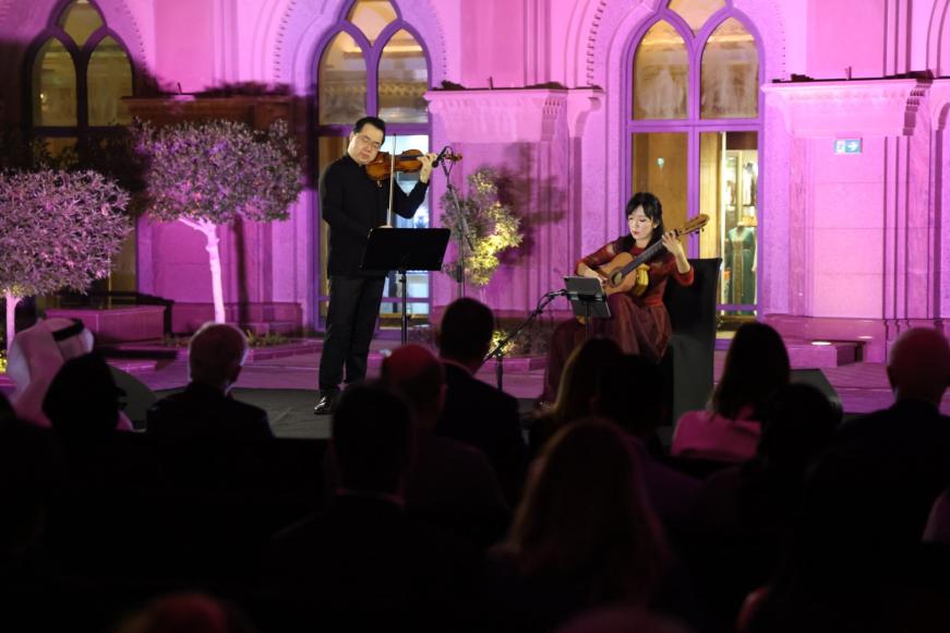 音乐会现场,知名小提琴家宁峰与古典吉他演奏家杨雪霏联袂献艺,精心演绎了中外经典曲目及阿联酋作曲家达尔维什的作品。悠扬的旋律引发全场观众强烈共鸣,现场掌声经久不息,充分展现了音乐作为跨文化交流载体的强大感染力。
