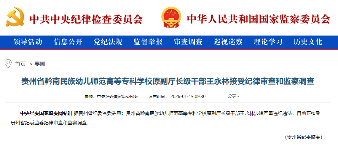 据贵州省纪委监委消息:贵州省黔南民族幼儿师范高等专科学校原副厅长级干部王永林涉嫌严重违纪违法,目前正接受贵州省纪委监委纪律审查和监察调查。(贵州省纪委监委)