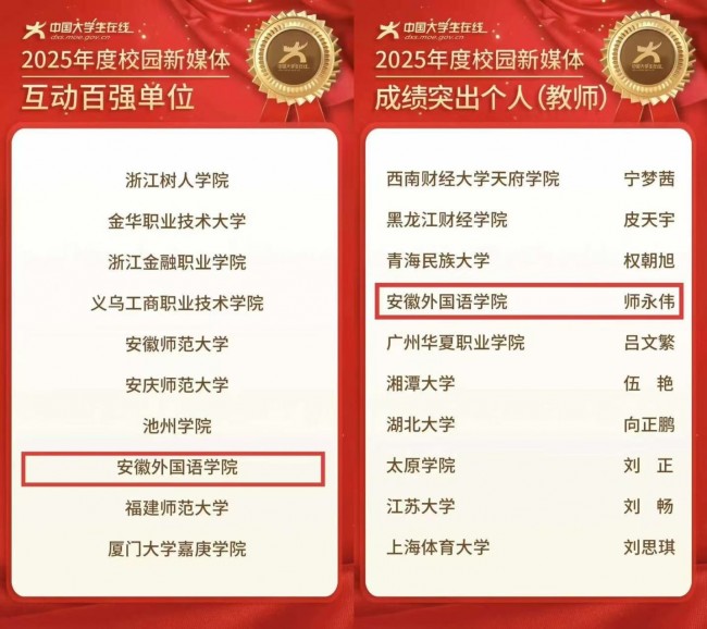 近日,教育部中国大学生在线正式公布2025年度校园新媒体融合共建名单,安徽外国语学院喜获“2025年度校园新媒体互动百强单位”称号,学校新媒体指导教师师永伟荣获“2025年度校园新媒体成绩突出个人(教师)”称号。