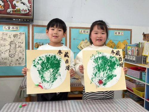 在白菜拓印画活动现场,孩子们蘸取五彩颜料,在画纸上轻轻按压、错落组合。翠绿的菜叶脉络在纸上晕染开来有的变成了层层叠叠的“冬日花田”;山楂雪球制作活动香气四溢,孩子们洗净红彤彤的山楂果,在老师的帮助下熬制糖浆、均匀裹衣,在动手过程中了解了大寒时节“食补养生”的传统习俗。