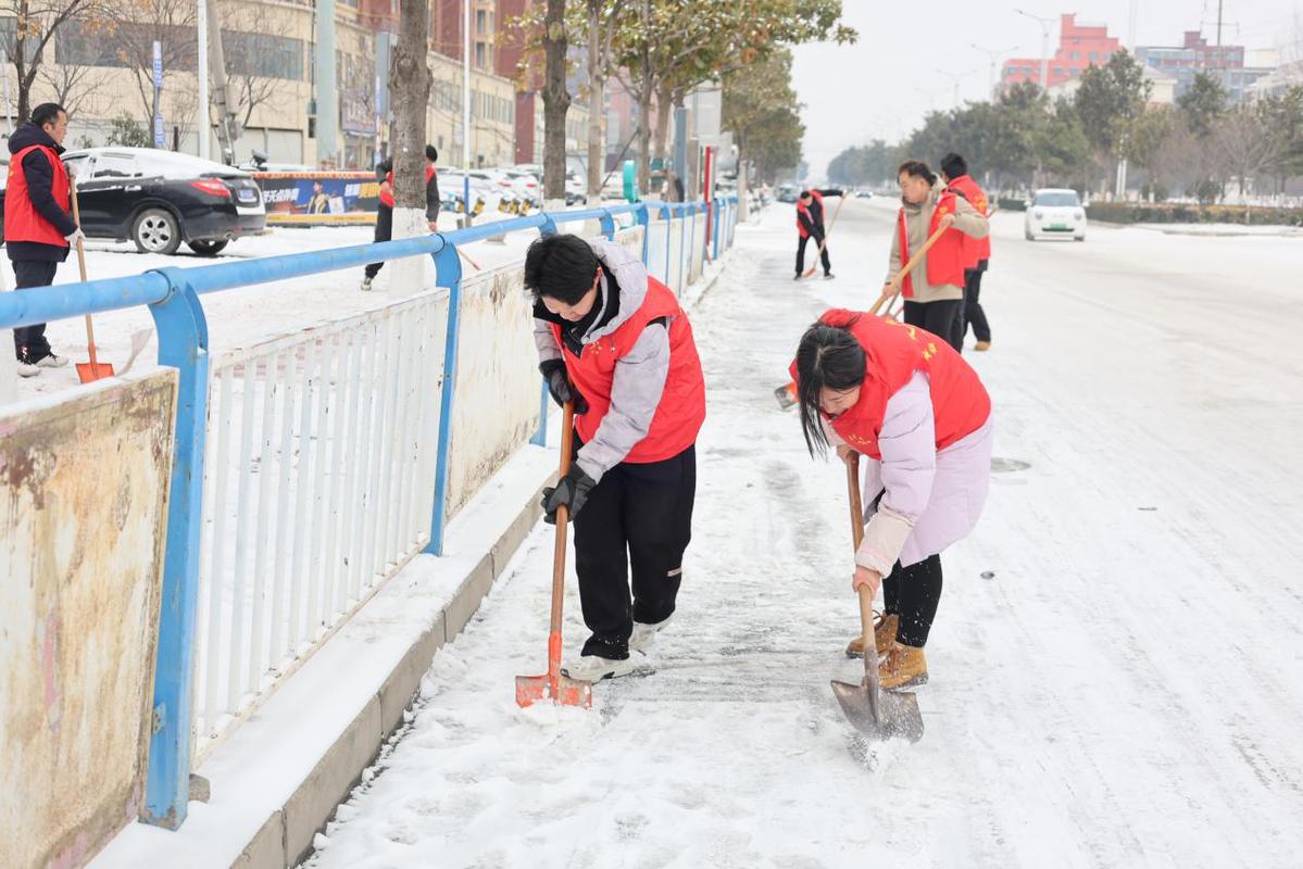 镇平县人民法院积极响应号召,第一时间组织干警组建志愿服务队,携带铁锹等工具奔赴责任路段开展扫雪除冰工作。现场寒风刺骨、积雪深厚,却丝毫未减干警们的工作热忱,大家迅速划分区域、明确分工,铲冰、扫雪、清路一气呵成,为群众开辟出一条安全畅通的出行通道。