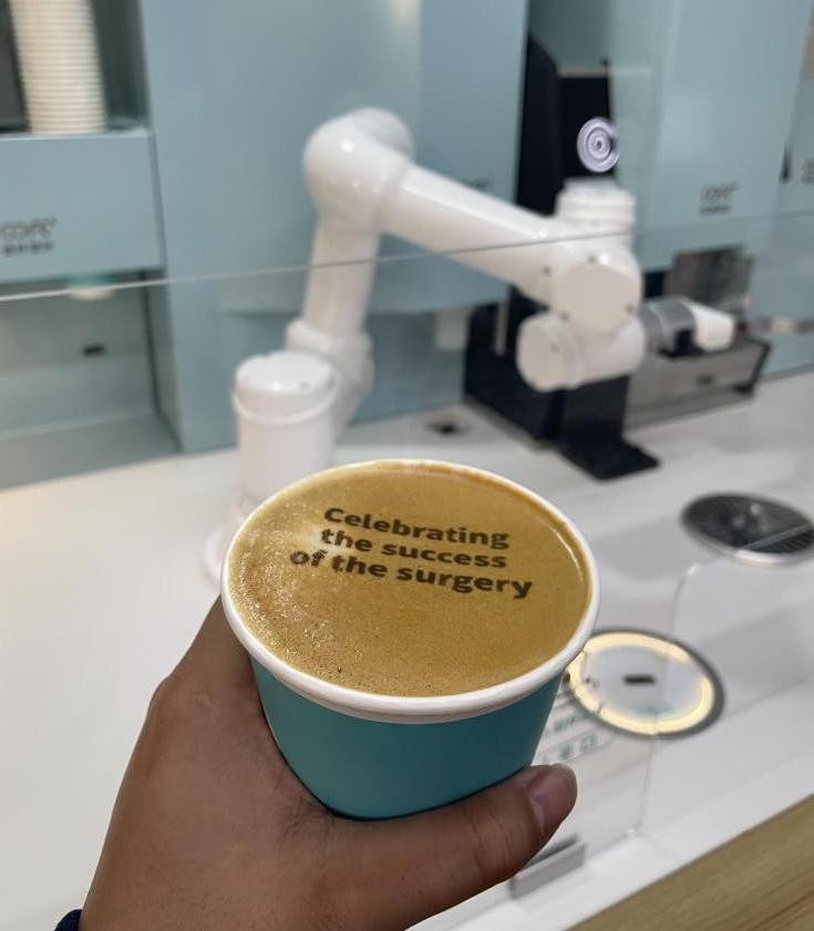 深夜两点,医院急诊科的凯特医生结束一台紧急手术后,在休息区用手机扫了一下码。50多秒后,这台酷炫前卫的COFE+第六代咖啡机器人便递出了一杯热澳白咖啡,奶泡上还打印着“Celebrating the success of the surgery”(庆祝手术成功)的字样和一颗爱心图案。