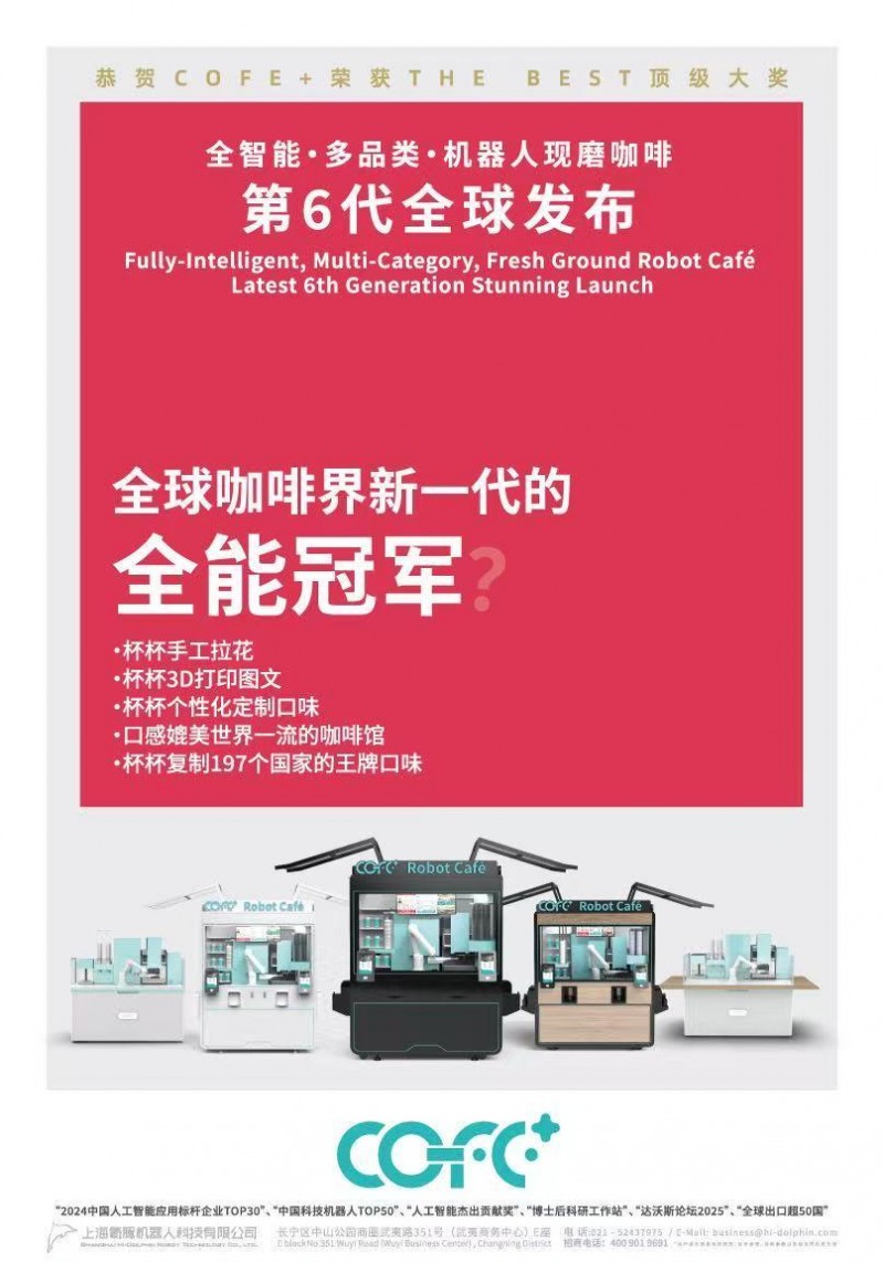 上海氦豚机器人科技有限公司研发推出的第六代全能冠军咖啡机器人COFE+,正是针对这些痛点设计的完美解决方案。这个占地面积不足2.35平方米的“咖啡超人”,拥有着令人惊叹的先进技术: