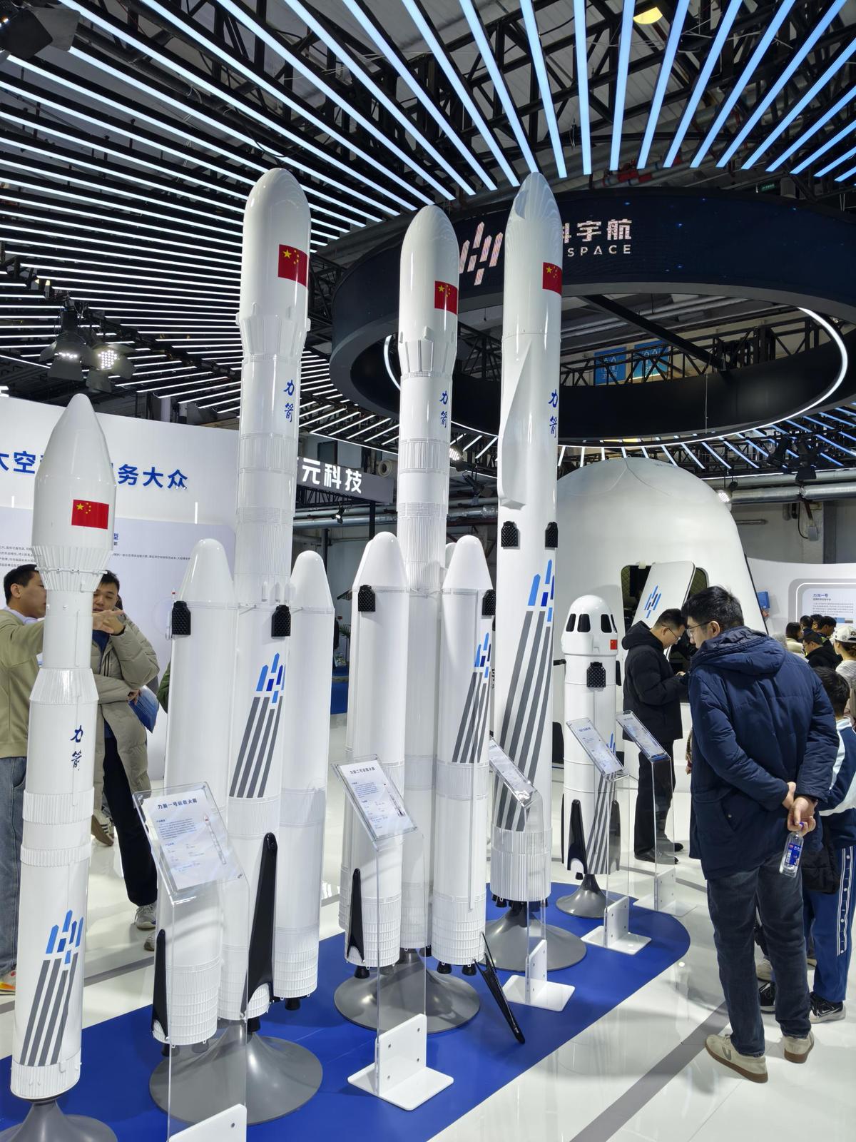2026北京国际商业航天展览会开幕,中科宇航研制的系列火箭模型在展览会现场展示。摄影 赵磊