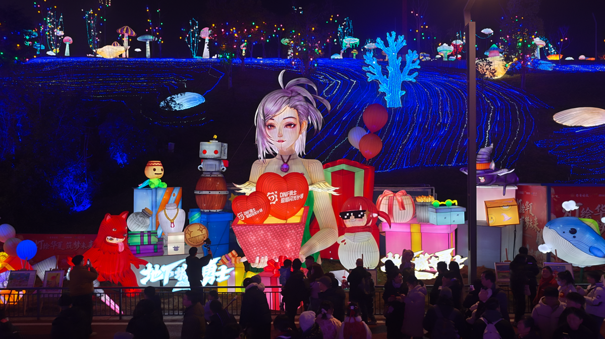 非遗工匠以精湛技艺,将游戏IP中的经典形象“赛丽亚”塑造为承载祝福的使者,手捧印有“DNF勇士爱心闪光计划”字样的红色爱心礼盒居中伫立,左侧红色吉祥物活泼灵动,右侧戴着墨镜的雪人形象憨态可掬,四处错落有致地摆放各式缤纷礼盒与玩偶。这些生动的彩灯形象与非遗技艺巧妙结合,构建起一个充满童趣与温情的艺术场景。