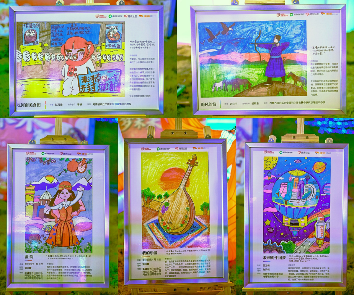 今年,板块内的一处展区吸引众多游客驻足,展区内陈列着8幅来自新疆、河南、内蒙古等地乡村学校的儿童画作。这些充满童真的作品均来自知名游戏IP《地下城与勇士》(以下简称DNF)端手游官方联合腾讯公益、成长守护共同发起的“艺笔一画,绘出未来”公益活动。
