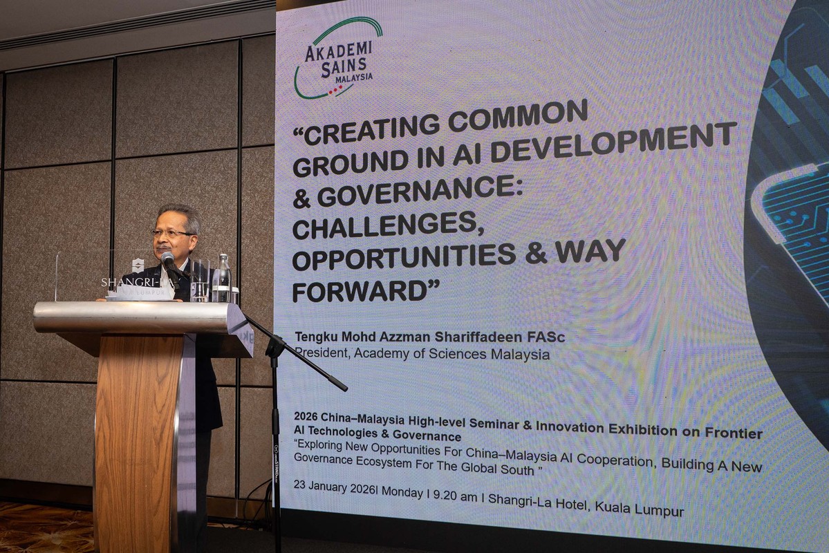 马来西亚科学院院长YM Academician Datuk Dr. Tengku Mohd Azzman Shariffadeen FASc 作“寻找AI发展与治理的共同基础”报告,呼吁中马及东盟在技术标准与伦理规范上寻求共识。