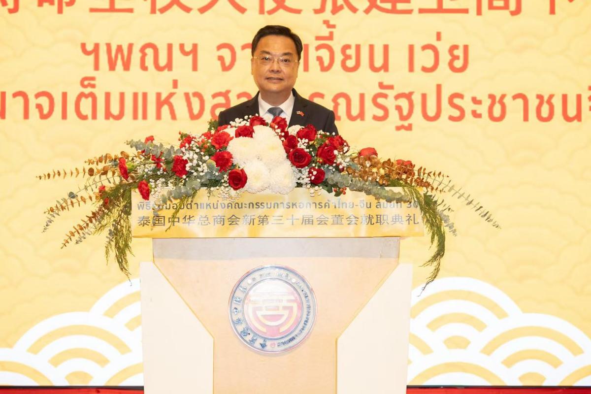 中华人民共和国驻泰王国特命全权大使张建卫在就职典礼上致贺词。他表示,泰国中华总商会作为泰华社会主要的龙头社团,有着光荣传统和辉煌历史,树立了泰华社团的典范,在助力泰国经济发展和社会公益事业、促进中泰友好和民心相通等方面作出了重要贡献。张建卫大使说:“中泰建交50周年是两国友谊继往开来的新起点。希望在林楚钦主席的带领下,泰国中华总商会继续为中泰民众谋福祉,为中泰命运共同体建设做贡献,为中泰友谊万古长青添光彩。”