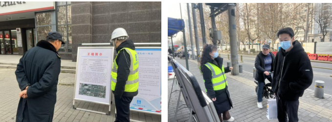 政策宣讲零距离,工程进展全知晓。为消除市民对工程建设的疑问,在施工现场设立便民咨询点,由项目管理人员组成宣讲团队,面对面为市民介绍工程建设背景、施工进展及积水治理技术方案。针对市民关心的施工周期、交通疏导、环境影响等热点问题,宣讲人员结合图示说明与通俗解读,逐一细致回应,让市民清晰了解工程建设的必要性与紧迫性。并详细介绍了项目建成后解决道路积水内涝的重要意义,进一步争取市民的理解与支持,搭建起工程建设与群众沟通的“连心桥”。