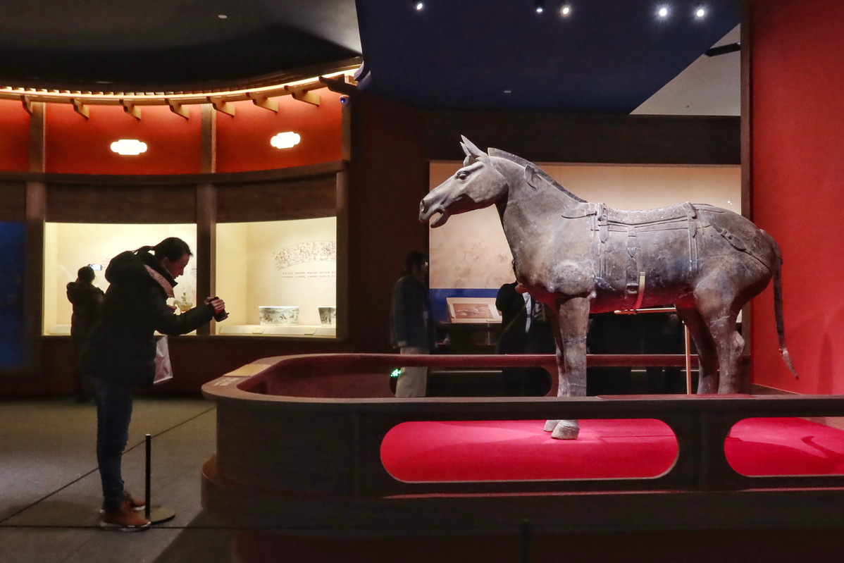 1月29日,参观者在预展上拍摄1977年陕西西安秦兵马俑二号坑出土的秦鞍马俑(秦始皇帝陵博物院藏)。中国日报记者 姜东 摄