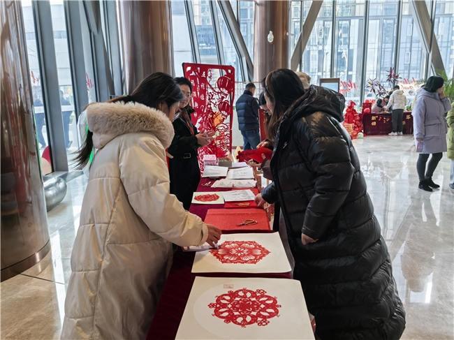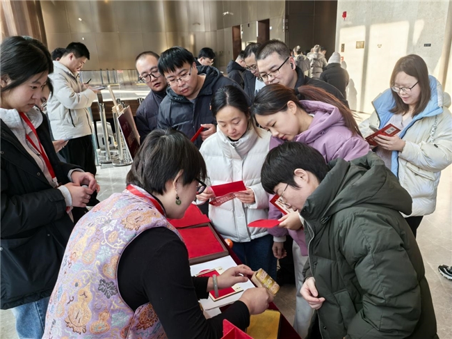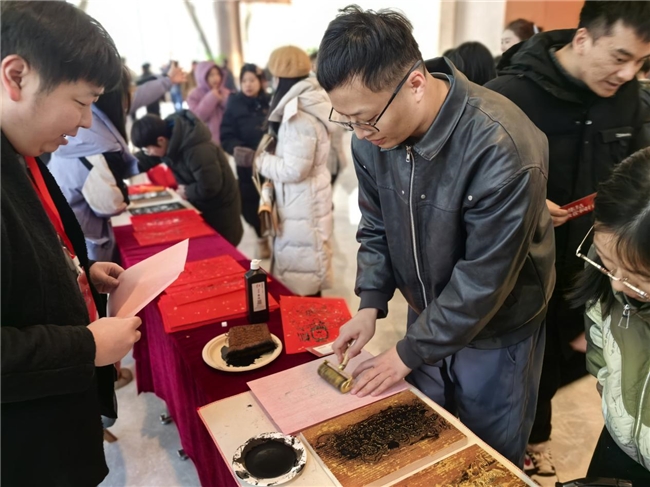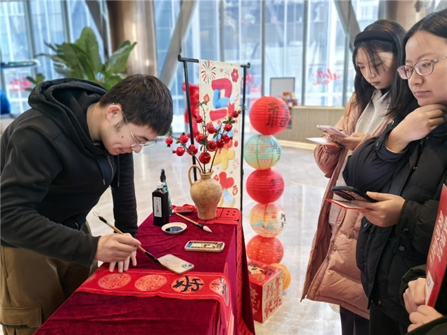 活动现场氛围热烈,员工们积极参与、笑语不断。据统计,本次活动共吸引楼宇企业员工120人参与,累计送出福字100幅左右、现场书写春联80幅左右,并送出拓印红包180个左右,活动现场充分展现了传统文化的独特魅力与浓厚年味。