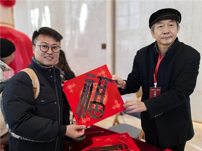 在“福字春联”摊位,书法老师现场挥毫,为企业员工书写定制春联与福字,笔墨之间传递着诚挚的新春祝愿;