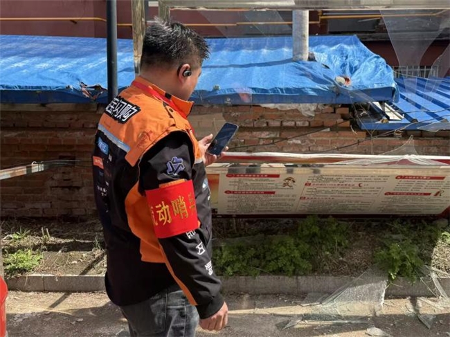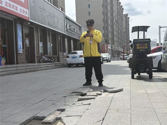 “哨兵”王磊上午9点送餐时发现一处路面地砖损坏,影响出行。他掏出手机,拍照、定位、发群,全程不过30秒。等他下午1点再次路过时,破碎的地砖已被重新更换。